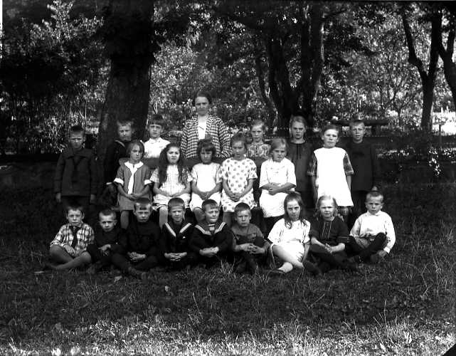 Småskolebarn från Adelöv med en kvinna i rutig klänning sitter och står på övre delen (östra) av Gränna torg.