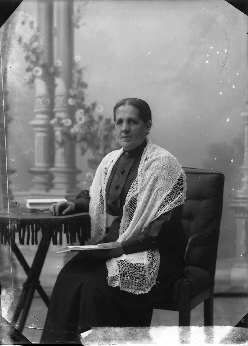 Porträtt av en äldre kvinna som sitter vid ett bord med en bok i vänster hand. Hon har en virkat sjal runt halsen.