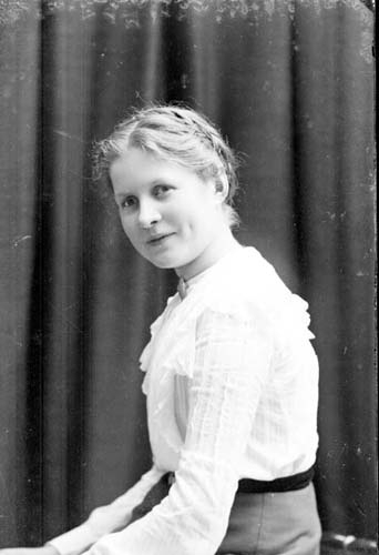 Bröstbild av en ung kvinna i ljus blus. Hon sitter i profil och vänder ansiktet mot fotografen.