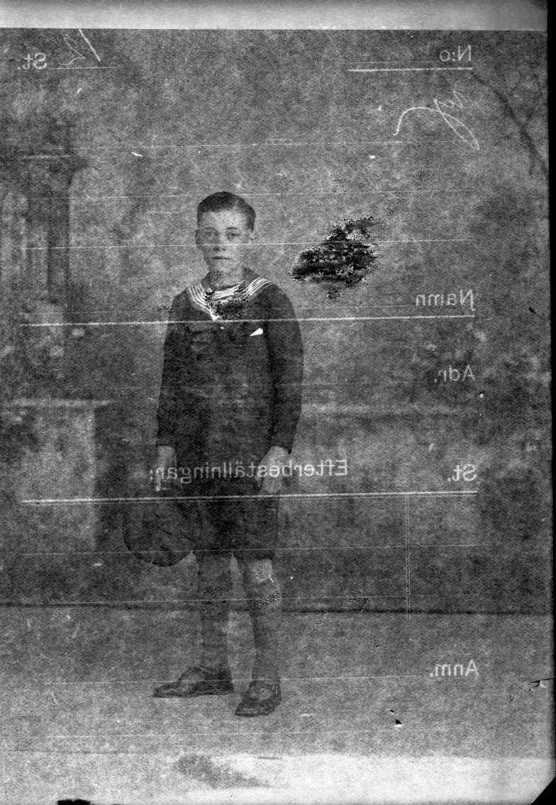 Porträtt av en pojke i sjömanskläder och keps i handen.