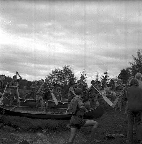 Man man stårframför en grupp med ungdomar. Han har korta shorts och knästrumpor. Undomarna står vid kanoter och håller i varsin paddel.