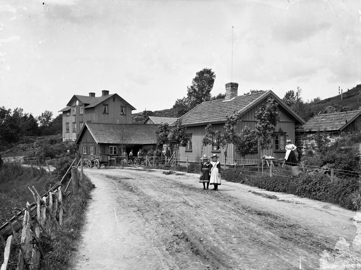 En landsväg löper förbi träbebyggelse; större mindre hus samt ekonomibyggnad, möjligen mindre stall el verkstad. Några arbetsvagnar står utanför samt män med en häst. Mitt på vägen vända mot fotografen står två yngre flickor med hatt och förkläde. Inne på gården till höger står en kvinna med hatt och förkläde vid ett trädgårdsbord.