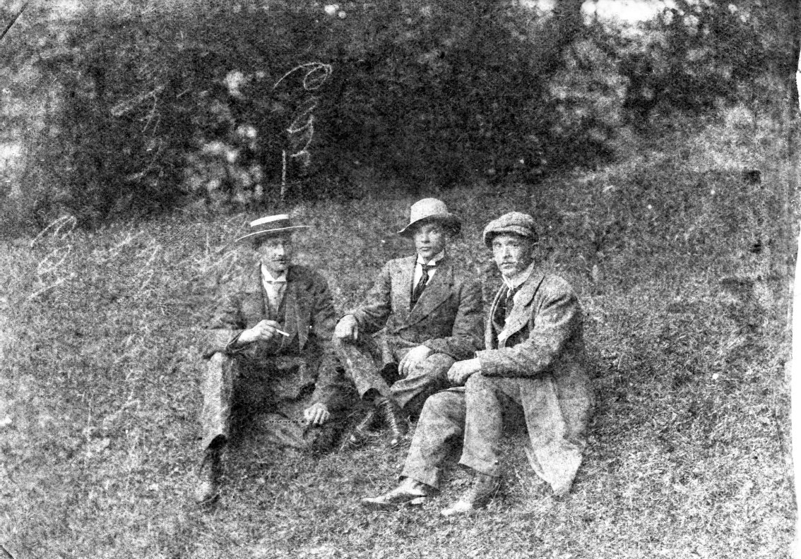 Tre unga män sitter i en grässlänt, sannolikt i närheten av Visingsborgs slottsruin. Mannen till vänster har möjligen en cigarett i handen.