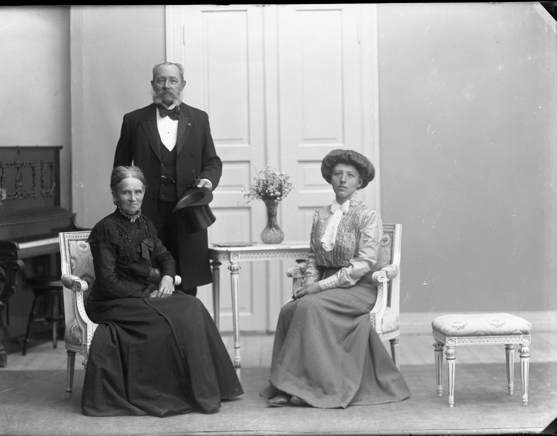 En ateljé med stilmöbler. En äldre kvinna sitter in en stol framför en man med mustasch och stora polisonger. En yngre kvinna sitter i en stol mittemot. De är högtidsklädda, mannen håller en hög hatt i vänster hand.