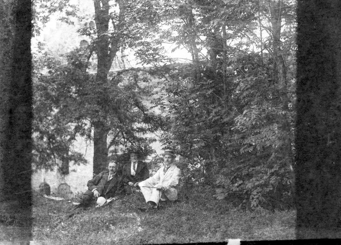 Två män och en kvinna sitter under ett träd vid Visingsborgs slottsruin.