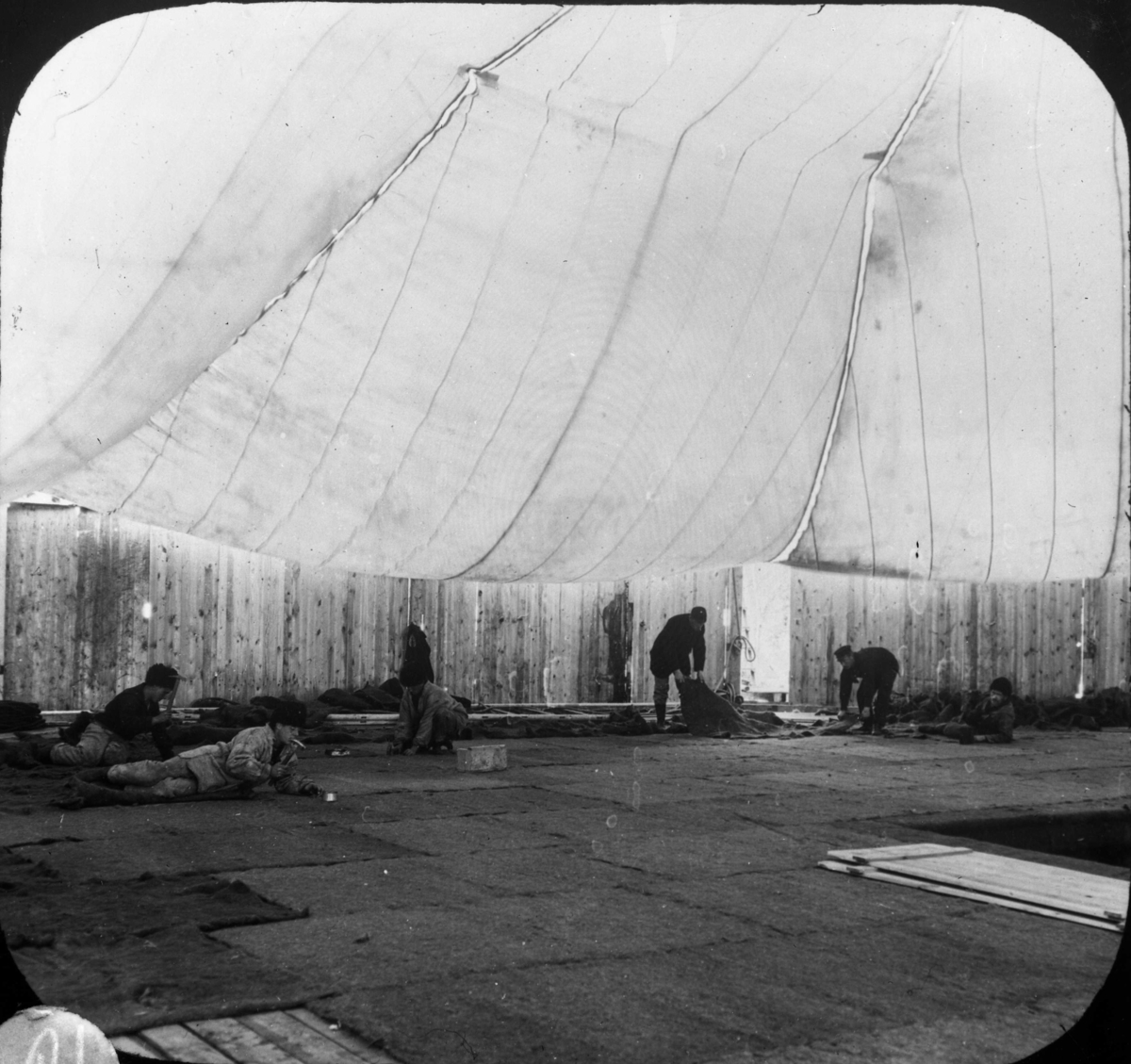 Ballonghusets golv täcks med filtmatta. S A Andrée lätt böjd med filt i händerna. Glasplåt.