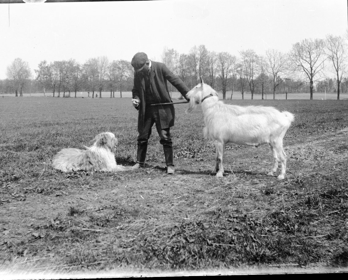 En man står vid en åker med en get och en stor lurvig hund, han verkar tillrättvisa hunden. Bakom dem en allé.