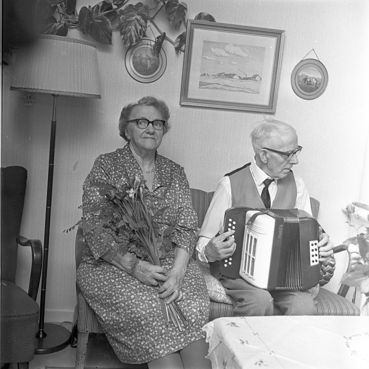 Ett äldre par sitter i en soffa, kvinnan har en blomsterbukett i famnen. Mannen spelar dragspel. De firar guldbröllop.