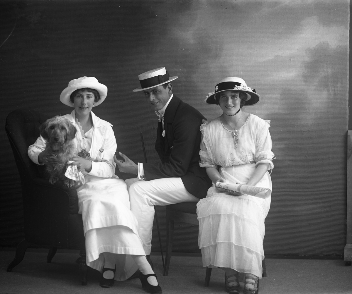 Friherrinnan Helga von Otter med hund till vänster, i övrigt okända personer.