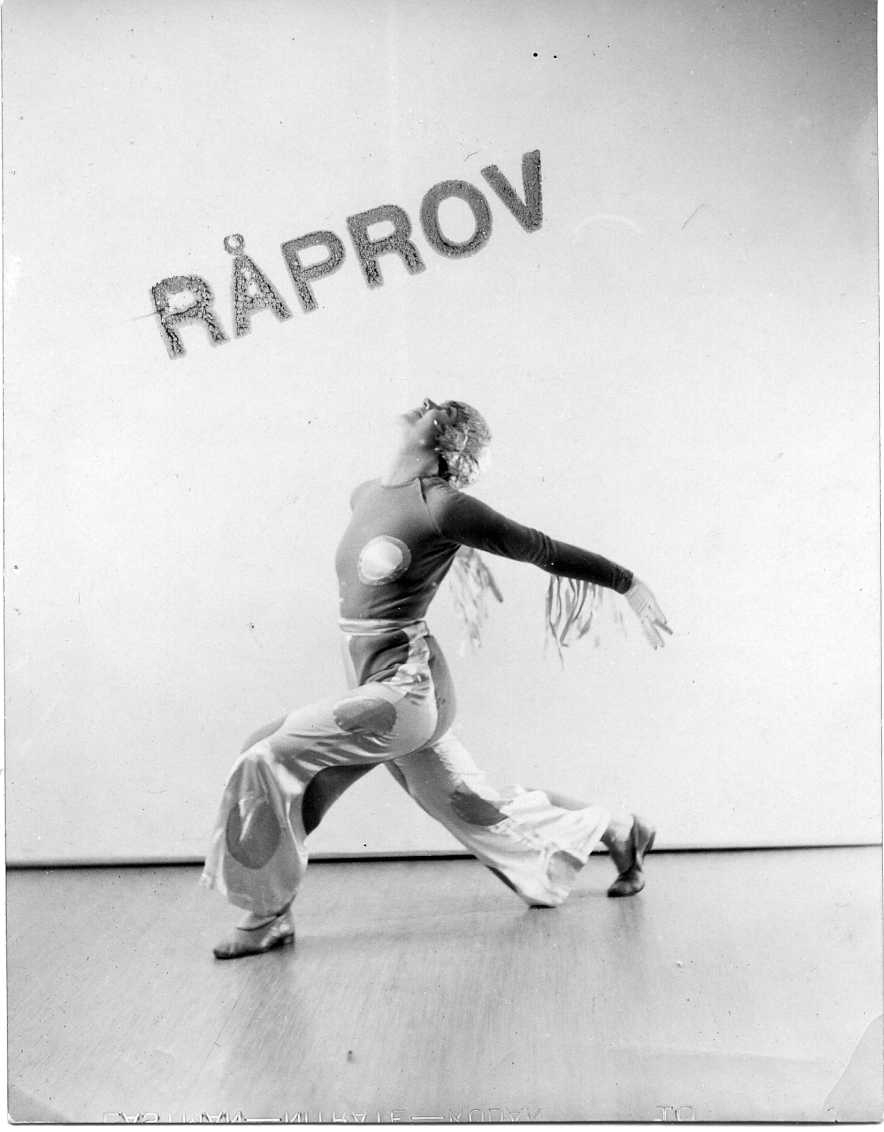En ung kvinna i danspose. Hon bär peruk, handskar med fransar och mönstrad dräkt (i blått, rött och vitt).