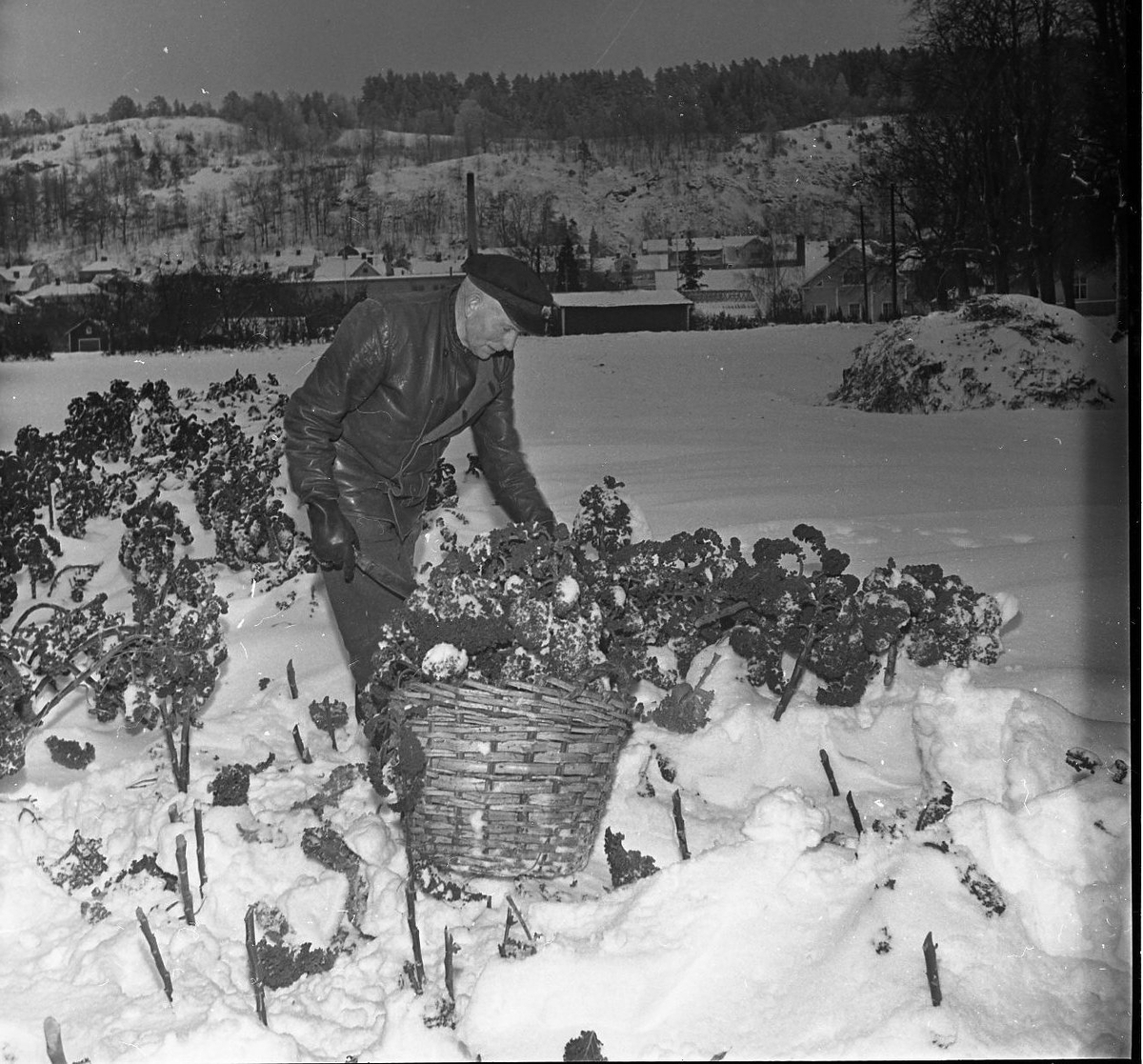 En man står och plockar kål och lägger en stor korg. Han håller en kniv i handen. Fältet han står i är täckt med snö.