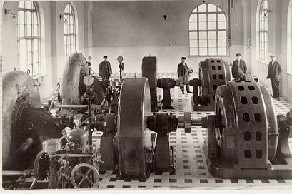 Interiör från maskinhallen i Röttle Kraftstation i Gränna. Fyra män står längst bort i lokalen, de är Johan Johansson, Erik Sandstedt, Carl Adolf Adolfsson och Gustaf Tollén,