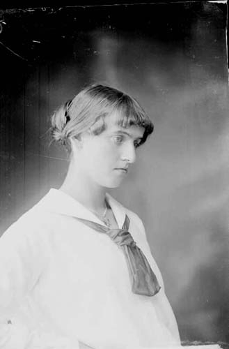 Bröstbild, 3/4-profil, av en ung kvinna med knut i nacken
