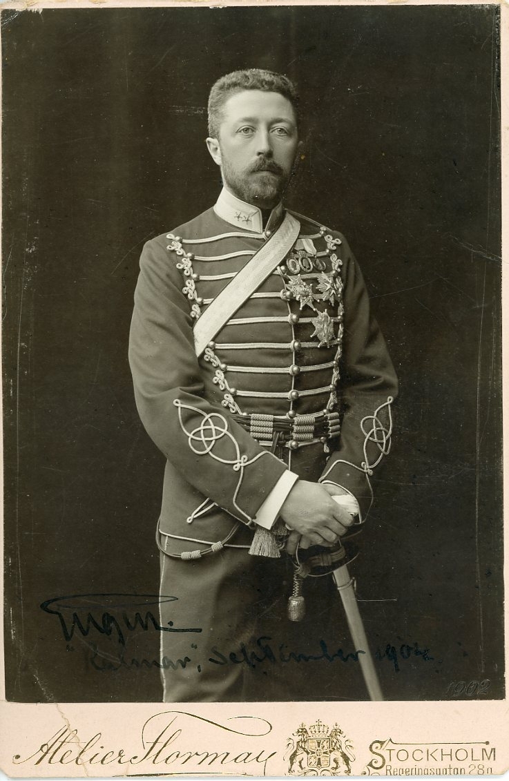 Kabinettsfotografi av en man i militär uniform med åtskilliga ordnar och med värja i handen.
