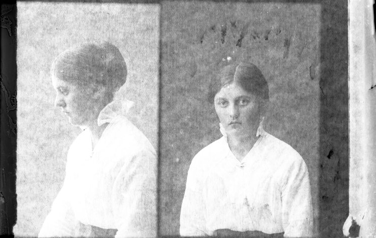 Bröstbild av en ung kvinna, profil respektive framifrån. Två bilder på samma glasplåt.