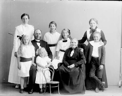 Holmström i Dunarp. Johanna Kristina och Frans August med döttrarna Signe (t v) och Frida (t h) samt den senares barn, fr v: Alice, Inez, Dagmar, Stina och Thorsten.