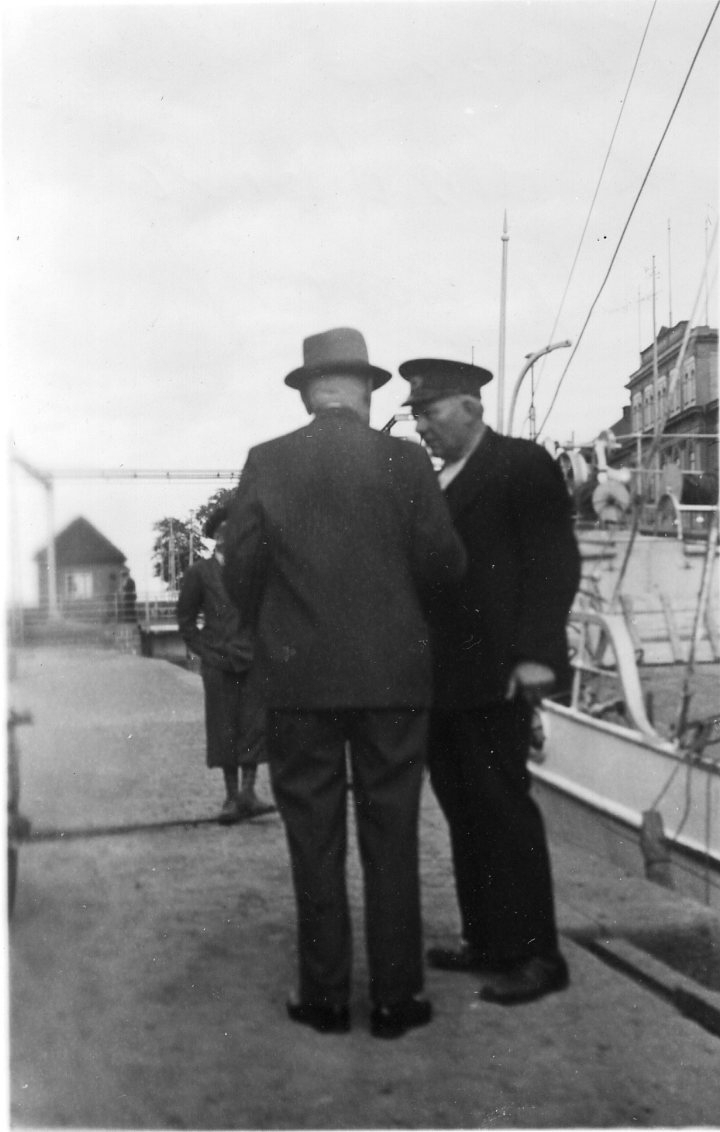 Ångbåtskapten K Lundberg vid kaj i Jönköping i samtal med en man.