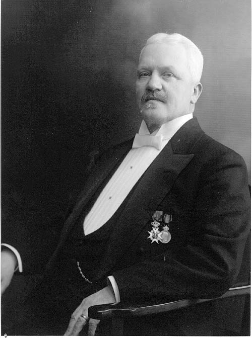 Porträtt av ingenjör Weman i högtidskläder med två medaljer på bröstet. Han sitter i en fåtölj.