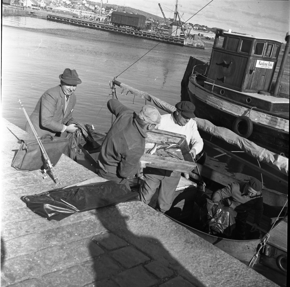 En inombordare ligger vid kaj. En låda med fisk lyfts upp ur båten av två män. På kajen ligger ett kastspö över en portfölj.