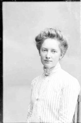 Porträtt en ung kvinna med uppsatt hår. Randig blus med hög krage och krås.