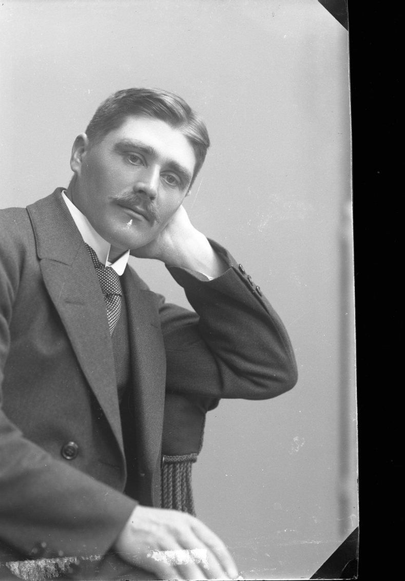Bröstbild av en sittande man som vilar huvudet i vänster hand, lite drömmande i blicken.