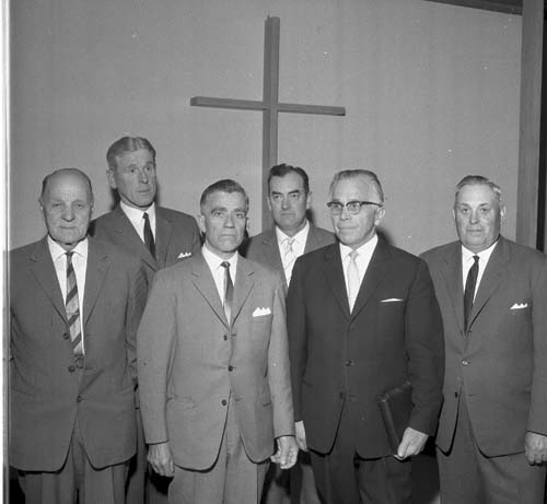 Sex herrar i mörka kostymer och slips står uppställda framför ett kors.