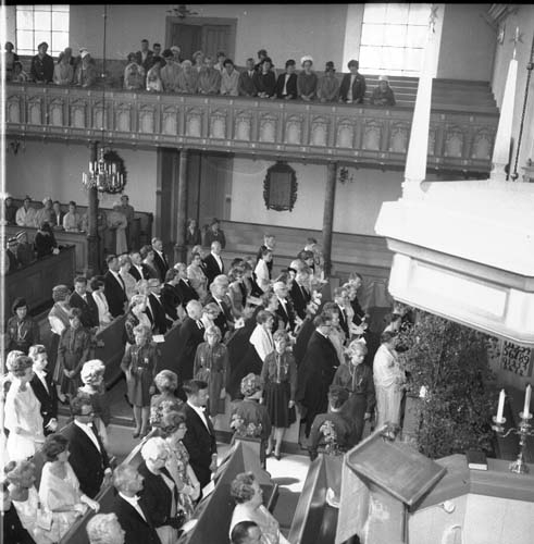 Titel: Fotot är taget från läktaren ned mot bröllopsgästerna. I förgrunden syns predikstolen. Alla besökare står upp. Längst med altargången står unga kvinnor uppställda på båda sidorna. De har alla likandnde klänningar.