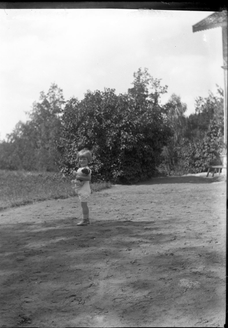 Ett barn står i profil på en grusplan med ett gosedjur i famnen, hen vänder sig mot fotografen. Det är sommar. Troligen "gossen Falkenberg".