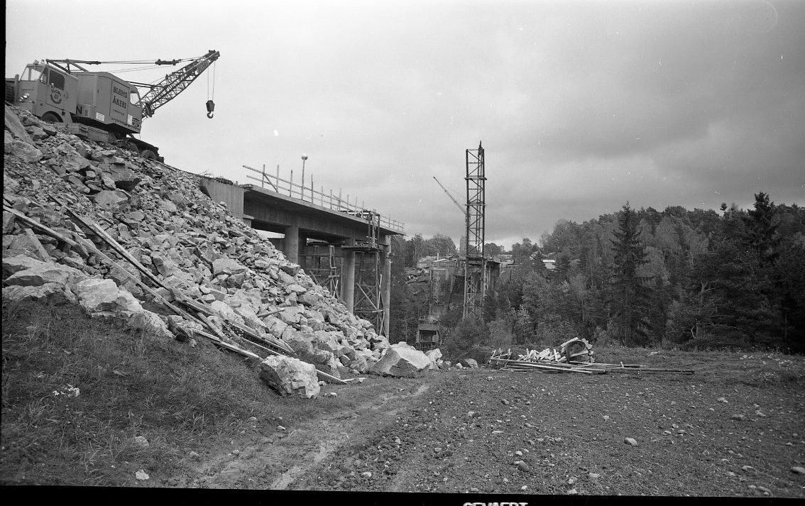 Titel: En motorvägsbro under uppförande över Röttleravinen söder om Gränna. En kranbil till vänster.