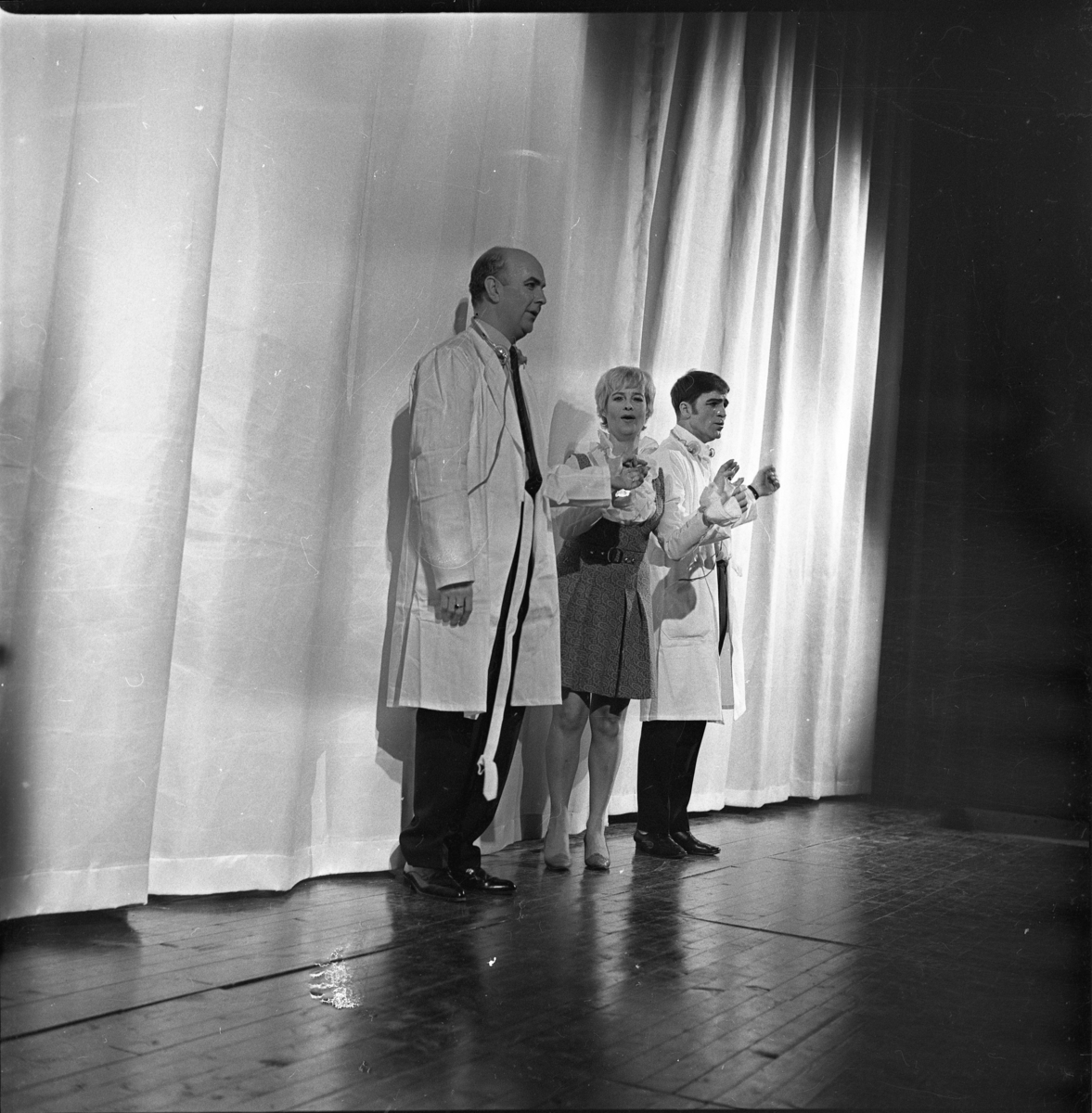 Två män, möjligen agerande läkare, på scen med en kvinna. D repeterar för en nyårsrevy.
