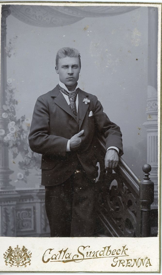 Kabinettsfotografi av en okänd ung man med slips, näsduk och en blomma på kavajslaget.