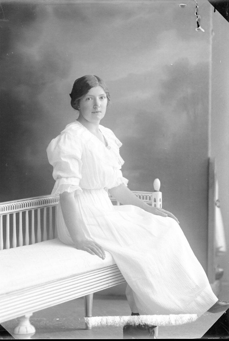 Porträtt av en ung kvinna i vit klänning som sitter på en soffa.