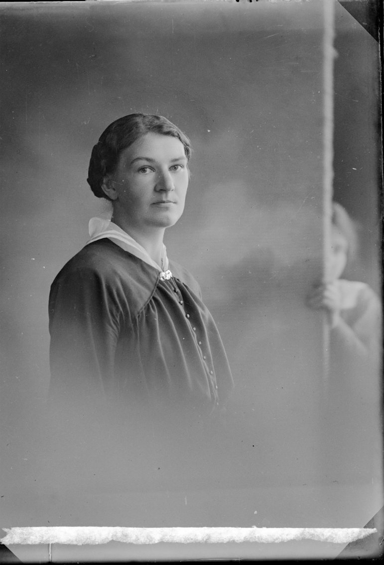 Porträtt av en kvinna från sidan, hon vänder ansiktet mot fotografen. En annan kvinna kikar fram i bakgrunden bakom en vägg.