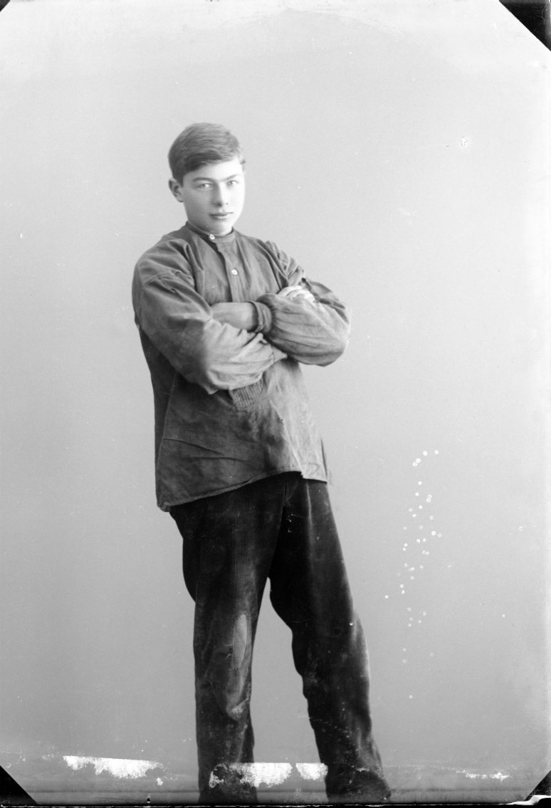Porträtt av en pojke i övre tonåren. Han bär arbetskläder och står lite avslappnat med armarna i kors.