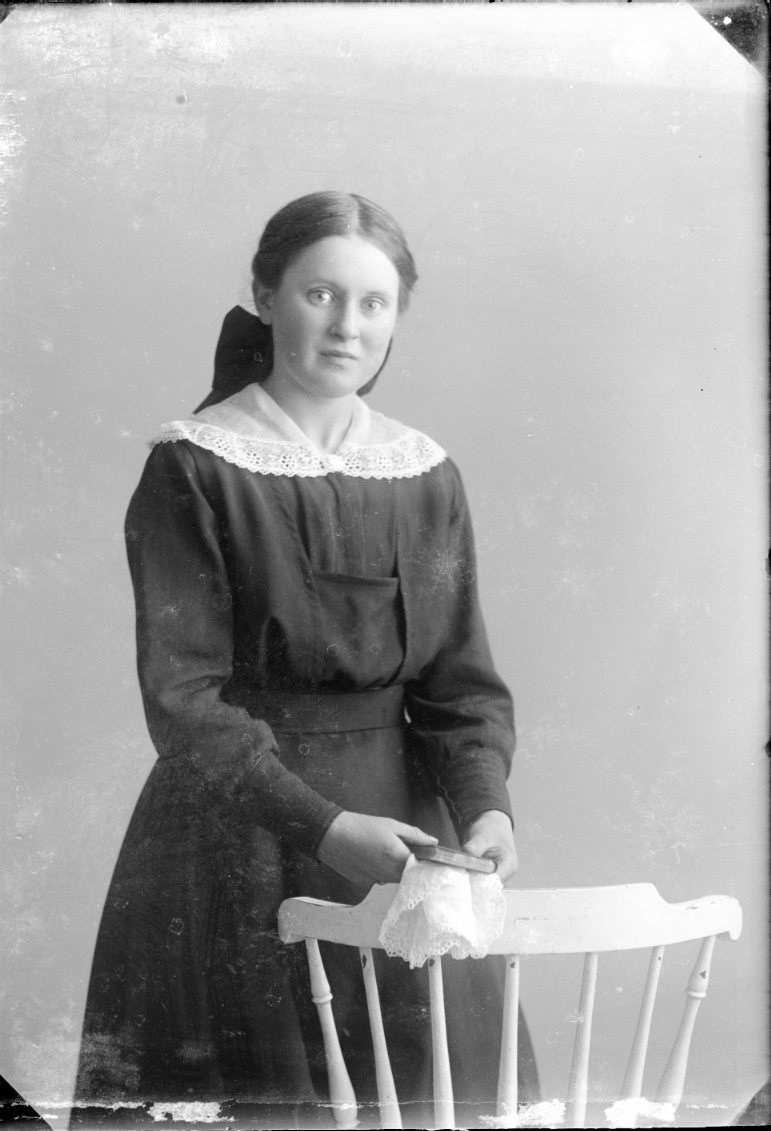 Porträtt av en flicka i tonåren, möjligen konfirmationsbild, i mörk klänning med vit spetskrag. Hon står mot en ryggen till en pinnstol med liten bok och näsduk i händerna.