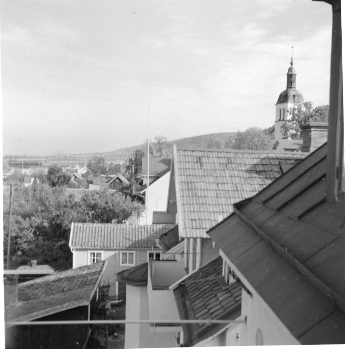Utsikt från en balkong mot bakgårdar norrut utmed Brahegatan i Gränna.