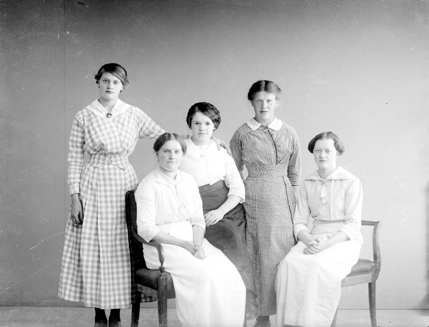 Gruppbild med fem kvinnor, varav två sittande. En tredje sitter på ett armstöd. Någon av dem heter Ester Johansson.