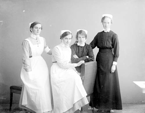 Fyra unga kvinnor i sjuksköterskeuniform, två i mörk och två ljus uniform. Någon av dem heter Emma Svensson, från Göteborg.