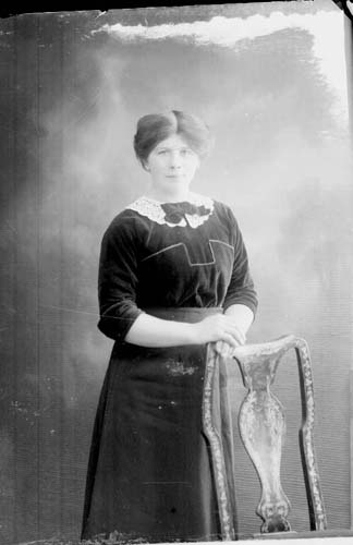 Porträtt av en kvinna som står med händerna på en stolsrygg.