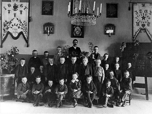 En skoklass med flickor, pojkar och den manliga läraren i bakgrunden. På väggen bakom dem hänger godtemplar-ordens fanor.