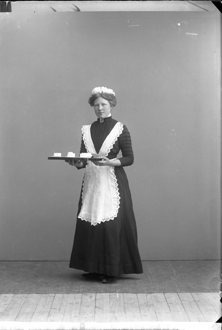 En ung kvinna i mörk klänning och kort förkläde med spetsbård står med en bricka i händerna.