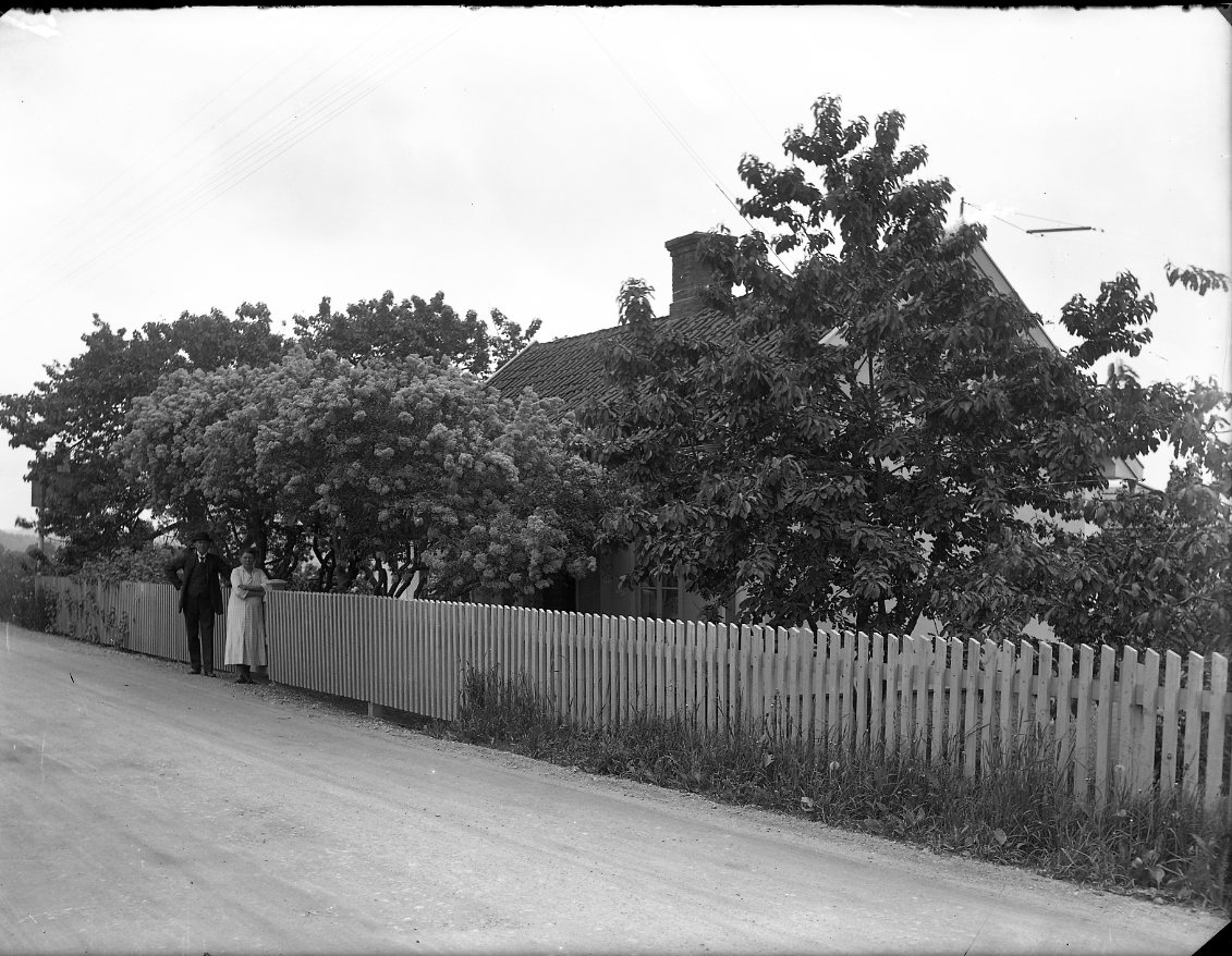 En man och en kvinna står vid ett spjälstaket utanför ett hus, till större delen dolt bakom fruktträd och syrénbuske.