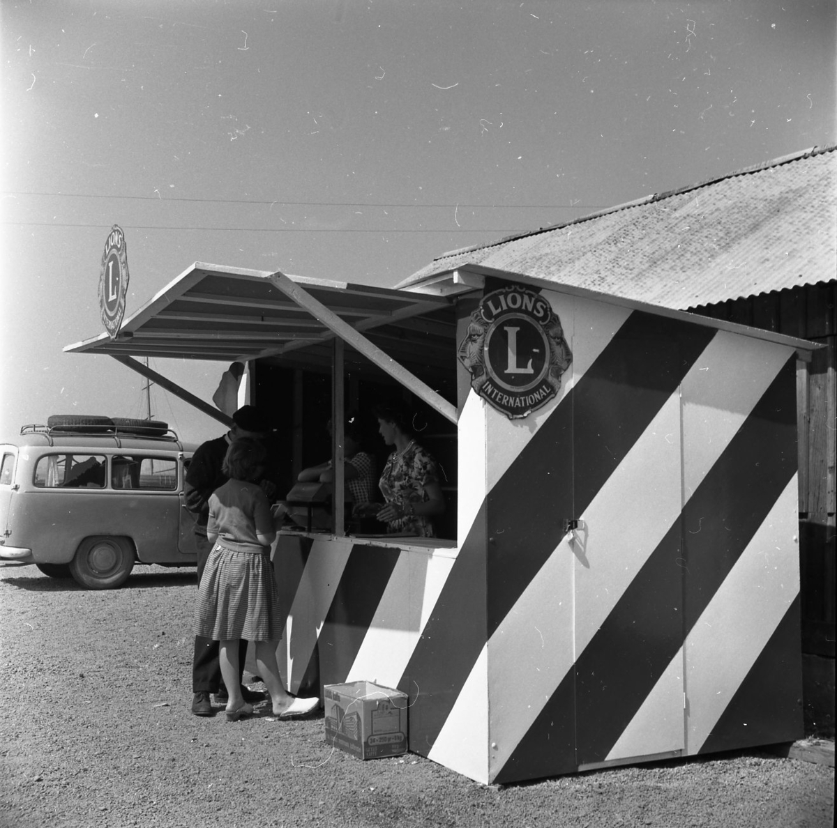 Ett par personer köper lotter i ett lottstånd med skylt för Lions. Sannolikt marknad i Gränna Lions regi. Troligen vid Gränna hamn.