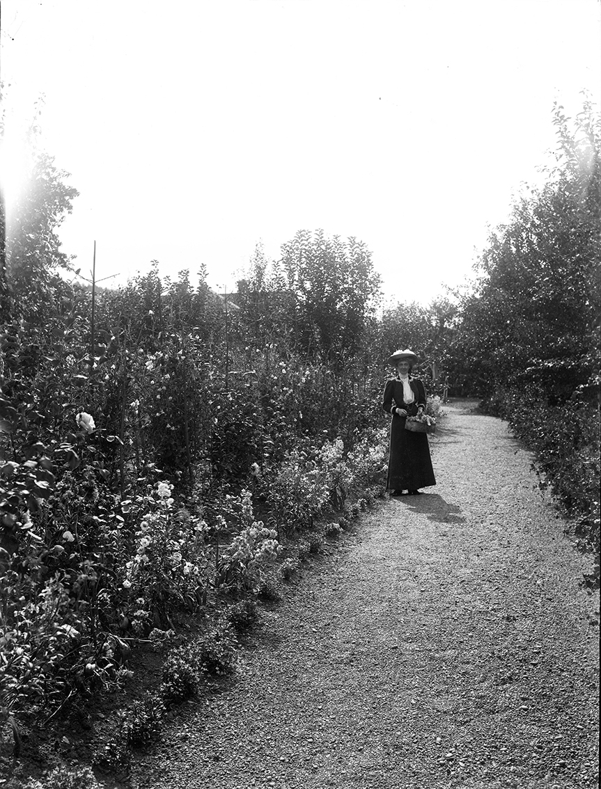 Porträtt av en kvinna på en grusgång i en trädgård. Hon har hatt och bär på en korg.