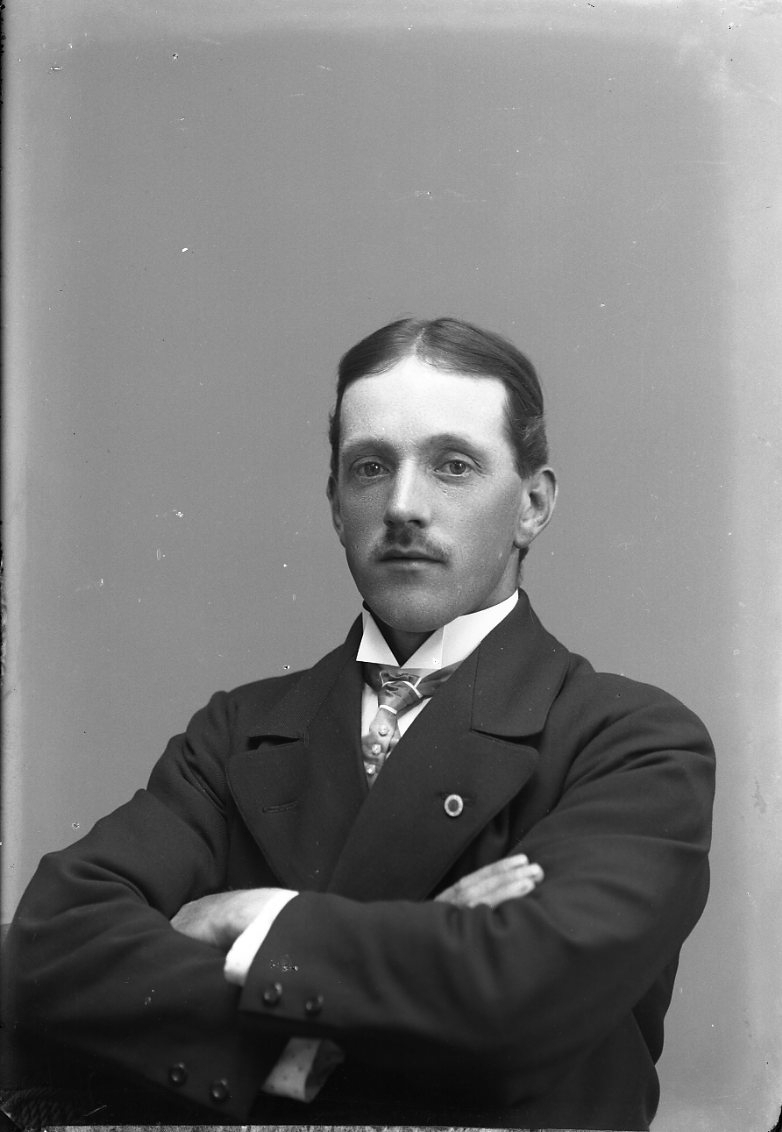 En ung man med liten mustasch och myndig uppsyn sitter med armarna i kors.