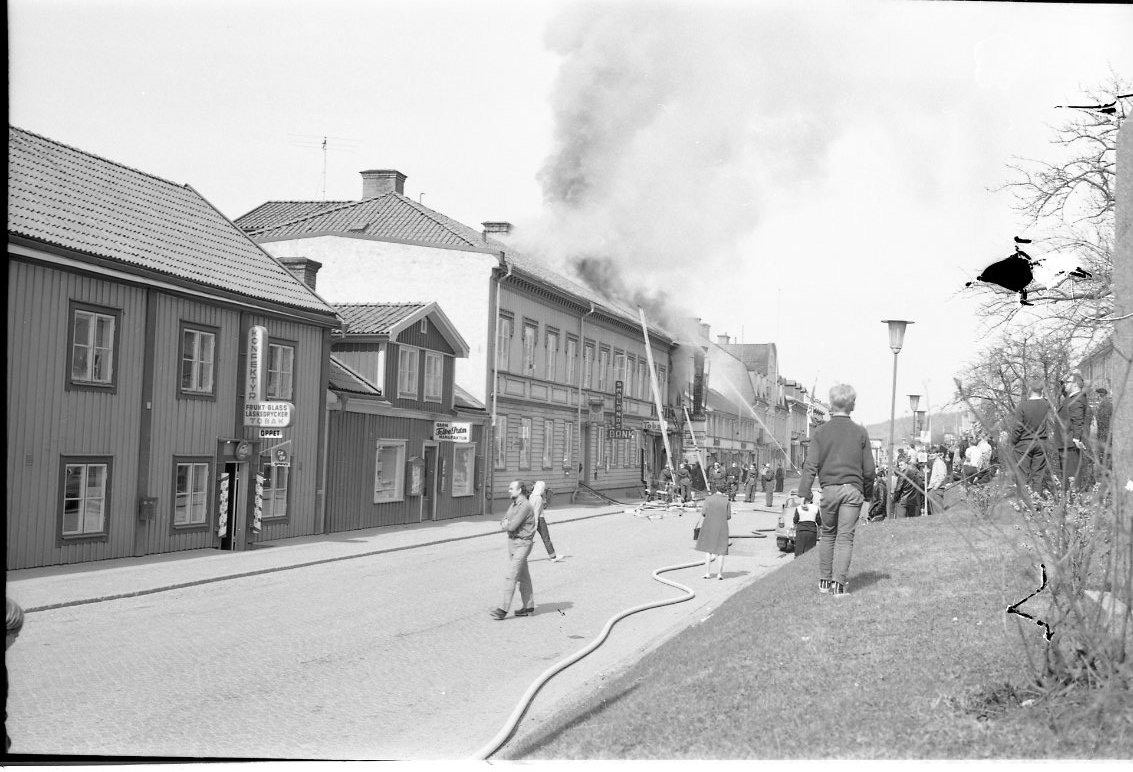 Det brinner i en fastighet utmed Brahegatan i Gränna. De ryker från taket. Brandmän står på gatan och bekämpar elden. En folksamling på trottoaren mittemot.