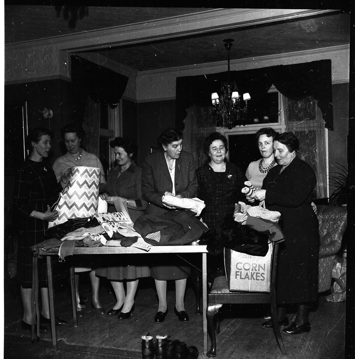 Sju damer står vid ett uppställt bord på vilket det ligger en klädhög, bland annat kavaj och strumpor. Där ligger också ett paket med julpapper och en kvinna till vänster klipper inslagningspapper från en rulle. Från vänster: Birgit Heldebrandt, Elin Gustafsson, Margit Antonsson, Karin Lindén, Maj Grennfelt, Birgit Thordoff och Carola Wendel.