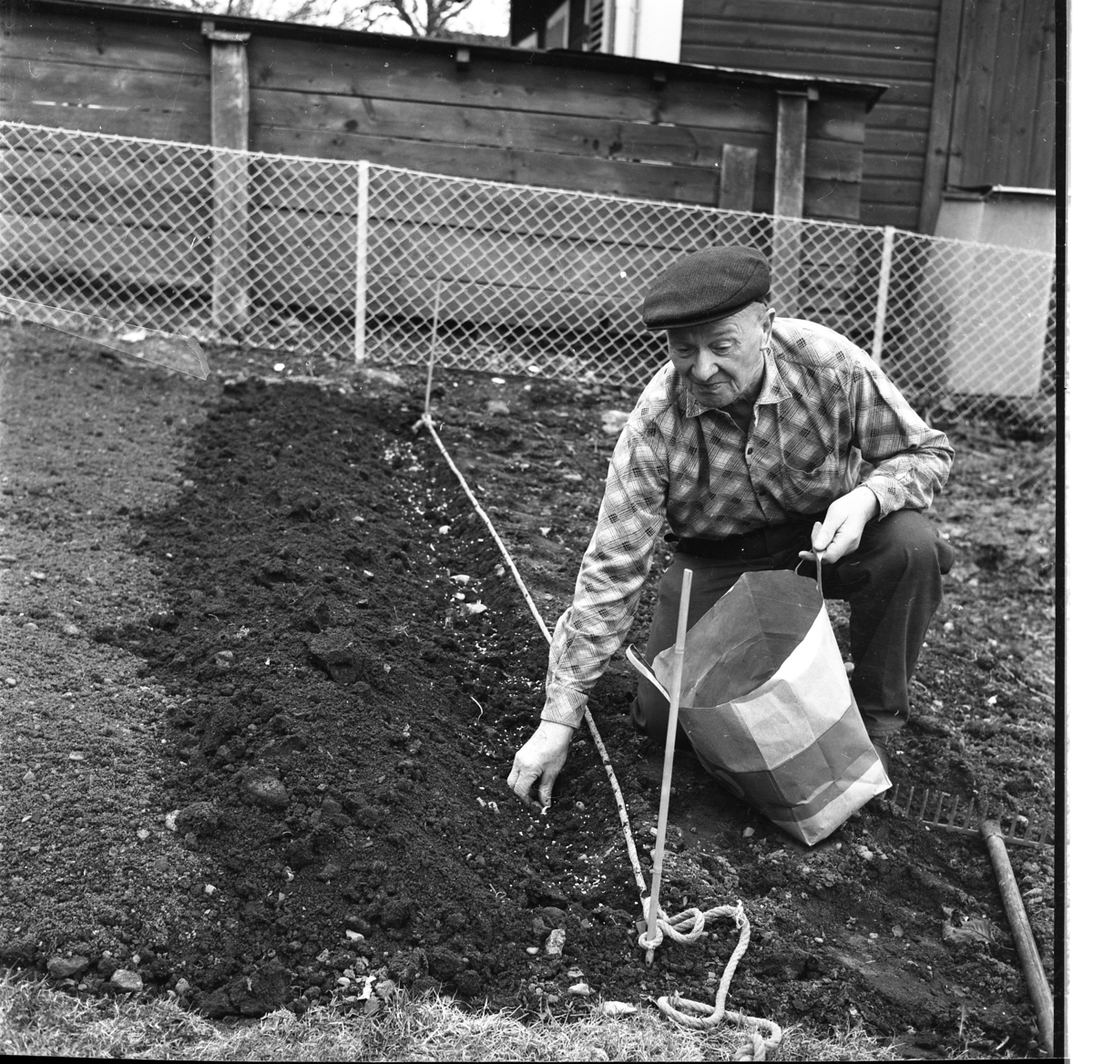 Erik Fager sitter på knä i ett trädgårdsland och sätter potatis, troligen. Han bär keps, rutig skjorta och har träskor på fötterna.
