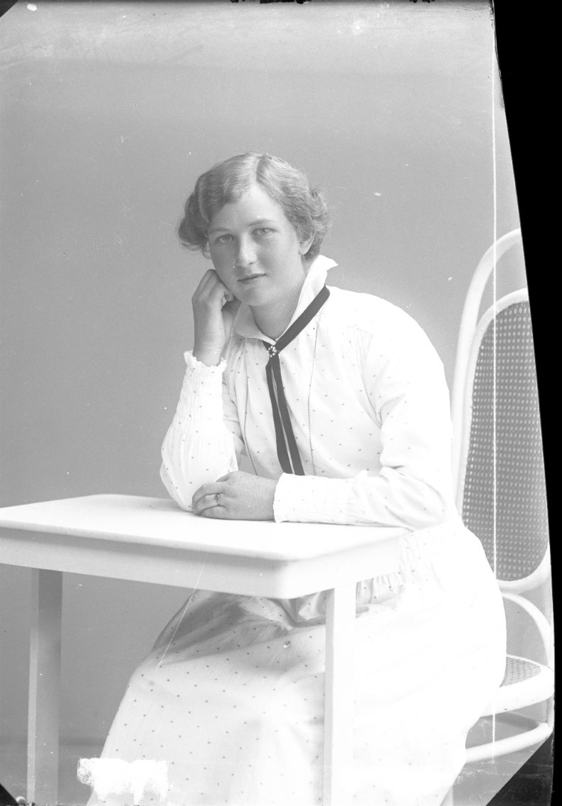 Bröstbild av en ung kvinna i en småprickig ljus klänning. Kragen uppställd och ett smalt mörkt band runt halsen. Hon sitter vid ett bord, vilar huvudet i höger hand.