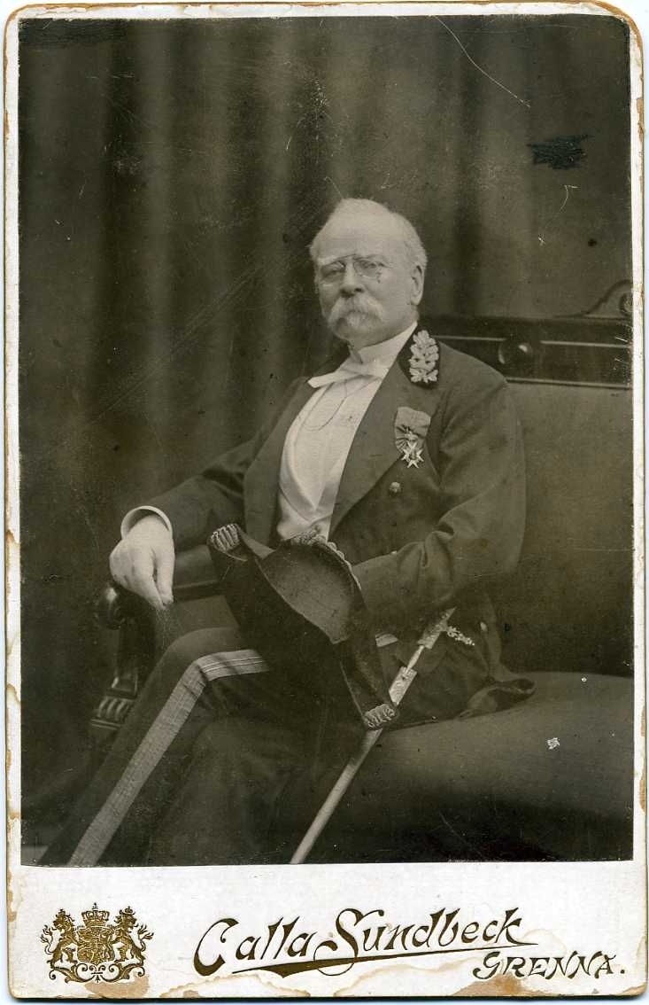 Porträtt av en äldre man med glasögon och skägg. Han sitter i en soffa klädd i borgmästaruniform.